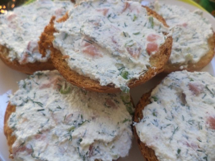 Очень вкусные бутерброды. На хрустящую булочку намазывается очень вкусная начинка со слабосолёным лососем.