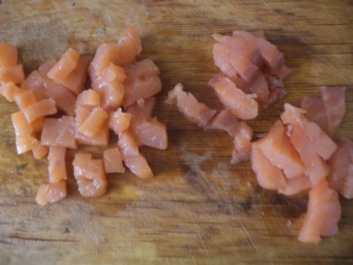 Слабосолёную рыбку нарезать маленькими кубиками, сбрызнуть свежевыжатым лимонным соком. Зелёный лук и укроп мелко порубить.