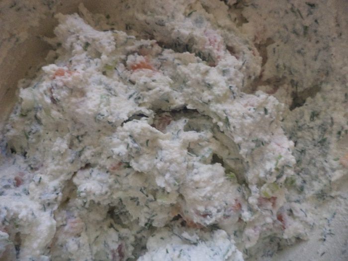 Перемешать творожную массу, рыбку, лук и укроп. Посолить, поперчить белым перцем.