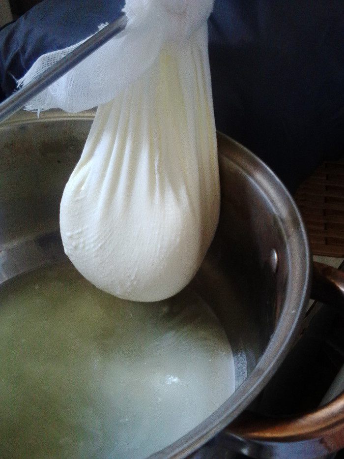 Возьмём несладкий йогурт (у меня домашнего приготовления), поместим в марлю и подвесим эту конструкцию для освобождения лишней жидкости примерно минут на 45-60. Образовавшуюся сыворотку можно использовать в косметических или кулинарных целях.