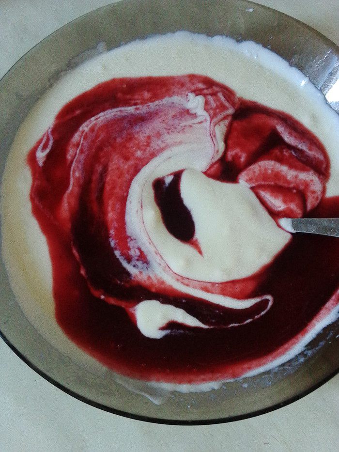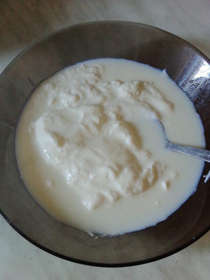 К густому йогурту добавляем молоко и перемешиваем до однородности.