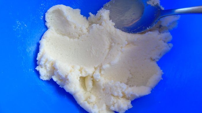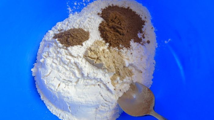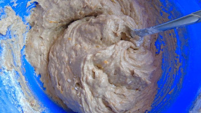 Добавляем муку с приправами и замешиваем тесто. Сначала тесто будет очень липким, но постепенно оно станет гладким, можно подсыпать муки.