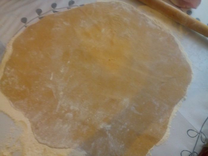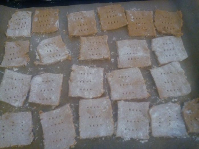 Раскатываем тесто и вырезаем печенье, я просто порезала на квадратики.