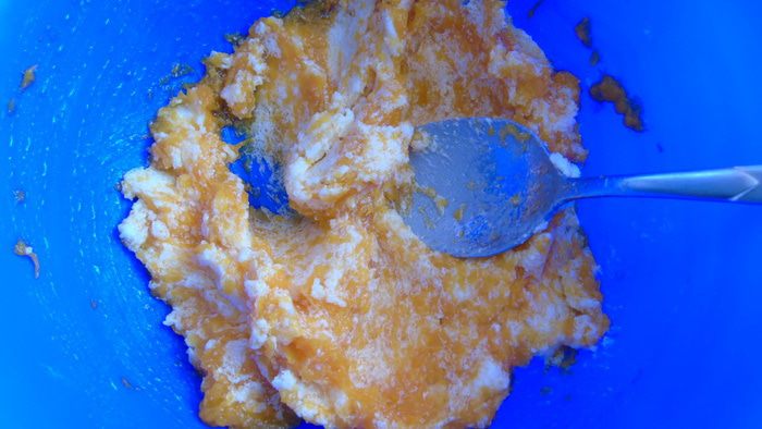 Добавляем к маслу тыквенное пюре и разрыхлитель, перемешать.