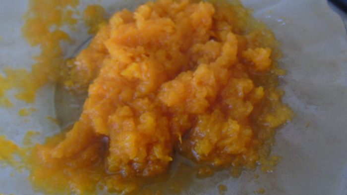 Тыкву нарезать кубиками, отварить до мягкости и размять в пюре.