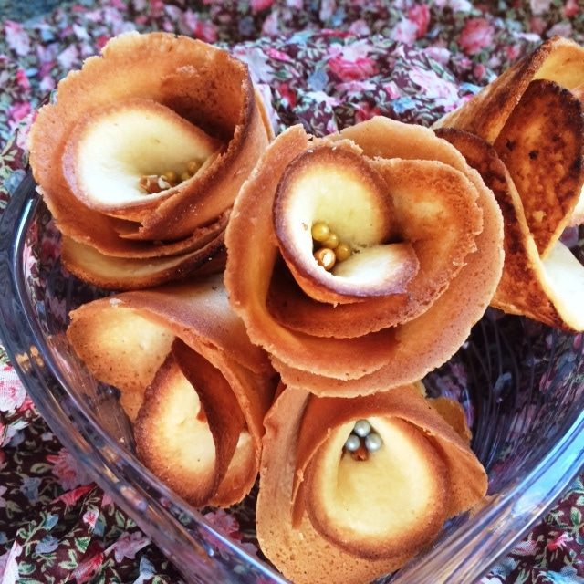 Берем тонкую лопатку, помогаем себе ножичком, поддеваем один лепесток и быстро прижимаем к соломке, склеивая ее вокруг. Нужно быть очень осторожным, т.к. тесто горячее. Так поступаем со следующими лепестками.