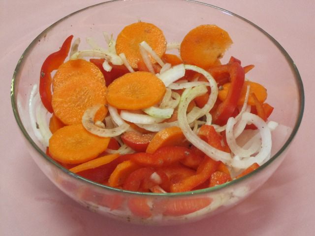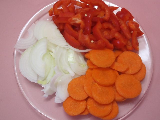 Лук нарезать полукольцами, очищенную морковь - кружочками, сладкий перец - кольцами или соломкой.