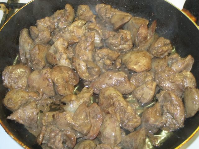 Добавить к овощам обжаренную печень, немного перемешать, чтобы часть овощей закрыла печенку.