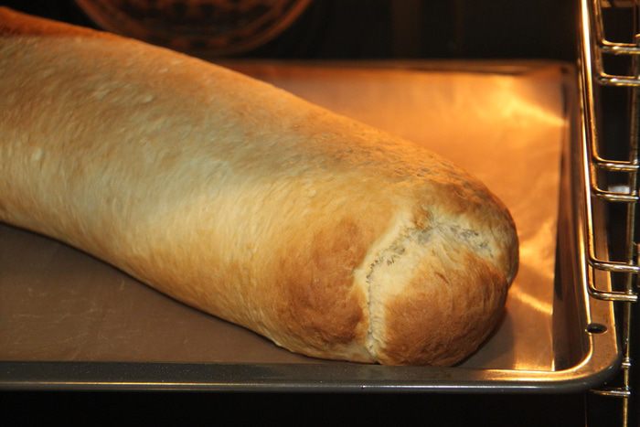 Переложить рулет на противень, на антипригарный коврик.