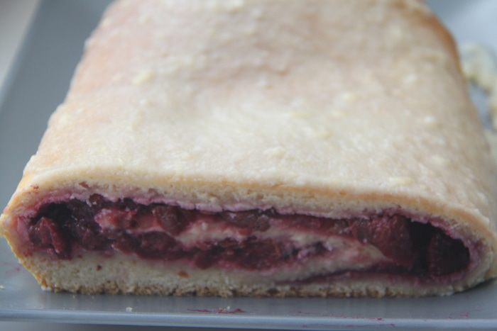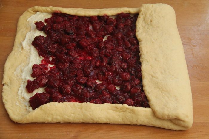 На сырный слой выложить вишнёвый соус. Тесто с краёв завернуть вверх, сложить пласт в виде плоского рулета.