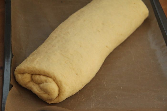 Замесить тесто из ингредиентов: в тёплом молоке с сахаром развести свежие дрожжи, добавить соль, растопленное масло, добавить яйцо, просеянную муку. Поставить тесто в тёплое место на подъём на 1,5 часа.