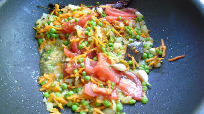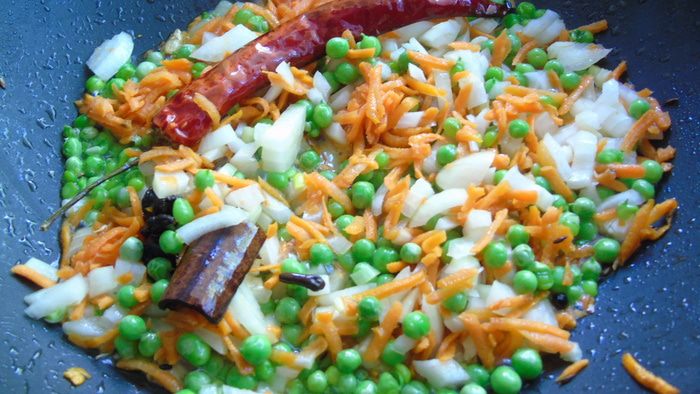 К специям добавьте нарезанный лук, натертую морковь и горошек. Поддержите на огне 2-3 минуты.