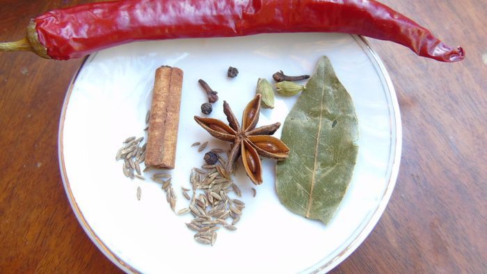 В разогретую сковороду налейте масло и доведите его до кипения. Добавьте приправы и обжаривайте несколько минут.