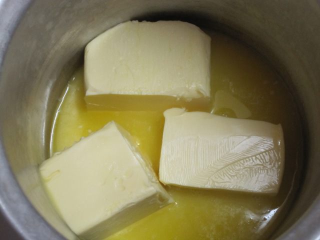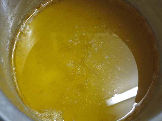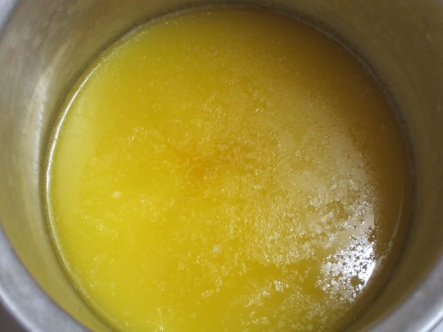 Затем остудила кастрюлю с маслом при комнатной температуре, потом поставила в морозильник. Когда верхний слой жира застыл, вынула кастрюлю, ножом проткнула масло в нескольких местах, слила сыворотку. Масло достала из кастрюли. Получилось топленое масло, которое можно использовать.