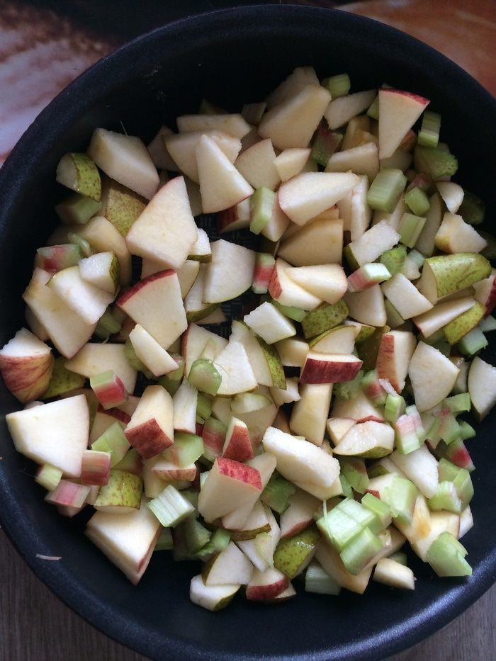 Нарезать в форму ревень (у него надо снять верхнюю пленку), яблоко и грушу.