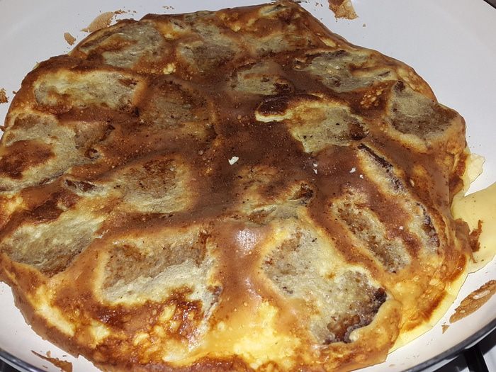 Перевернуть хлеб и залить яичной смесью, убавить огонь и накрыть крышкой.