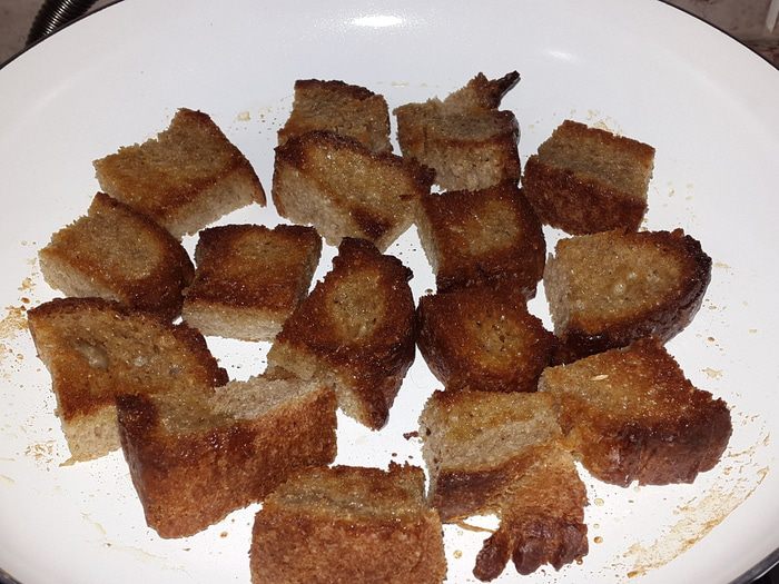 Хлеб разрезать на небольшие кусочки и поджарить с одной стороны на сливочном масле.