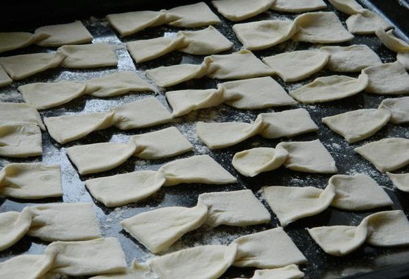 Каждый прямоугольник свернуть в виде бантика (как будто заворачиваем конфету) и уложить на противень, предварительно посыпав его мукой.