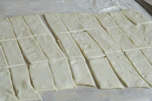 Тесто разморозить и раскатать в одном направлении. Нарезать на полоски, шириной примерно 1,5-2 см, потом на прямоугольники.