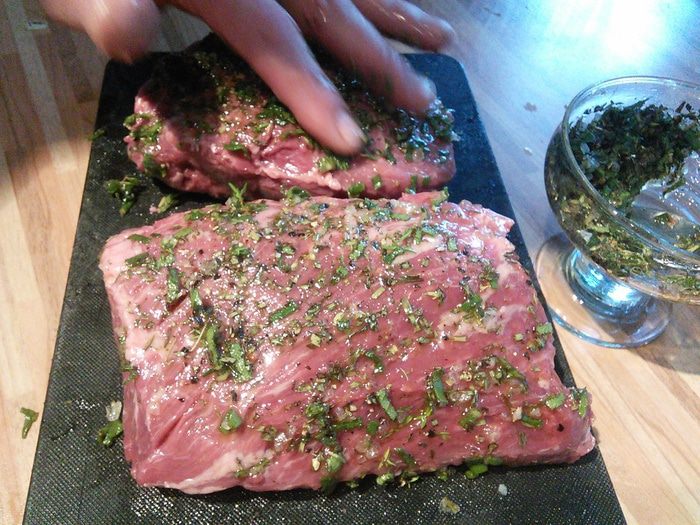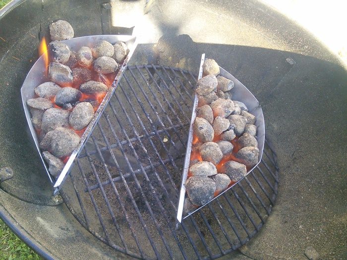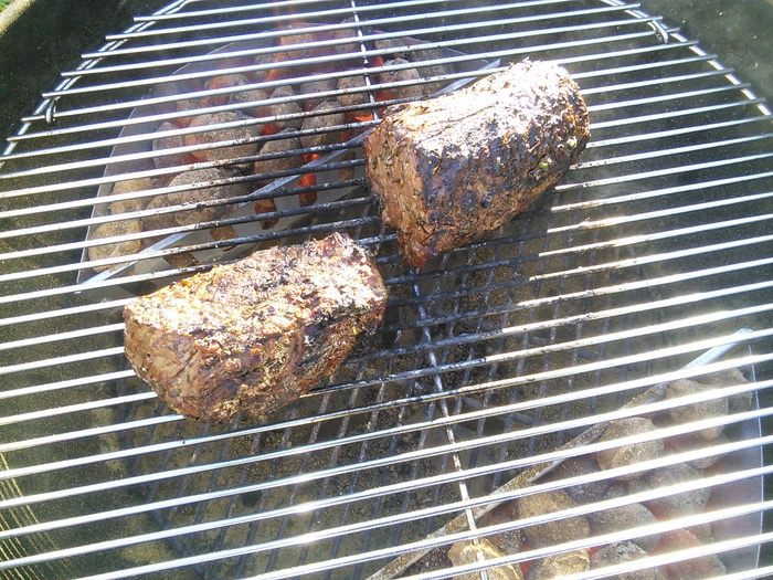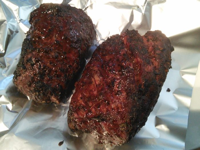 Затем угли отодвигаются и мясо грилится под крышкой, достигается эффект духовки. Температура от 175 °до 220°. 20-30 мин для средней прожарки, температура мяса внутри 50 - 52°(понадобится термометр), у нас прожарка более долгая 30 - 40 мин, при температуре внутри мяса 62 - 65°. Это на любителя. Кто-то скажет, что мясо безнадёжно испорчено, но каждый решает сам.