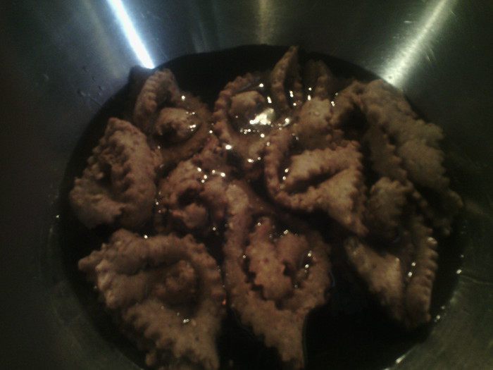 Сразу перекладываем в кастрюлю с мёдом, даём пропитываться и продолжаем жарить и складывать в мед. Даём постоять 10 минут.