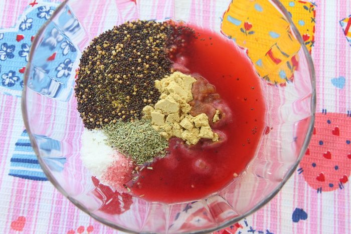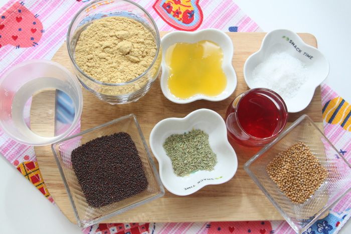 Отмерьте все ингредиенты. Понадобятся семена жёлтой и чёрной горчицы. Жёлтую (или белую) горчицу можно приобрести в любом магазине, а чёрную - в отделах индийских специй. Малиновый уксус я готовила сама по рецепту с сайта (всё просто: залить малину уксусом из белого винограда, настаивать 3 дня, процедить). Используйте уксус из красного или белого винограда, если нет малинового уксуса или малины.