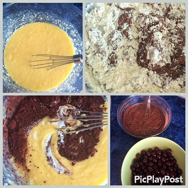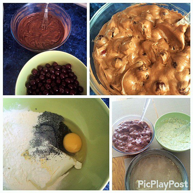 Замешиваем тесто и вмешиваем в него аккуратно вишню (свежую, предварительно удалив косточки или замороженную, кто чем богат).