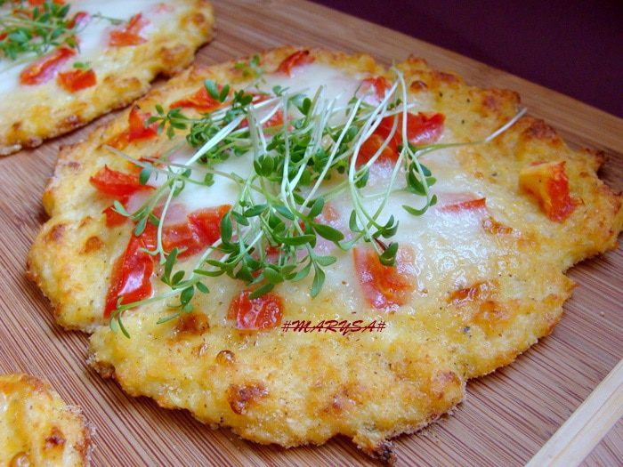 Тут я добавила еще крахмал, когда готовила вторую порцию, потому как без него, повторюсь, форму у меня готовые пиццы не хотели держать.
