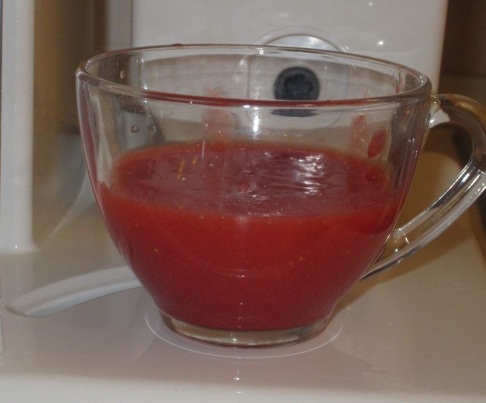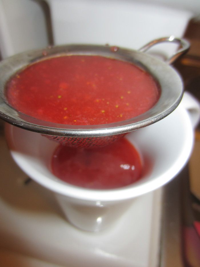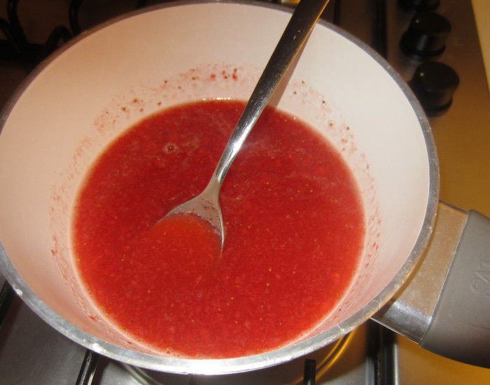 К сиропу добавить мякоть клубники и лимонный сок, все хорошо перемешать.