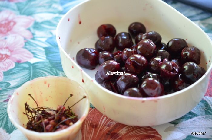 Черешню перебрать, помыть, удалить плодоножки и косточки булавкой.