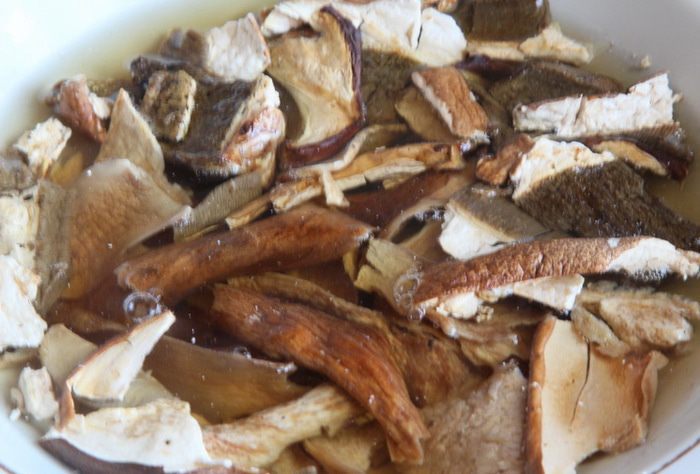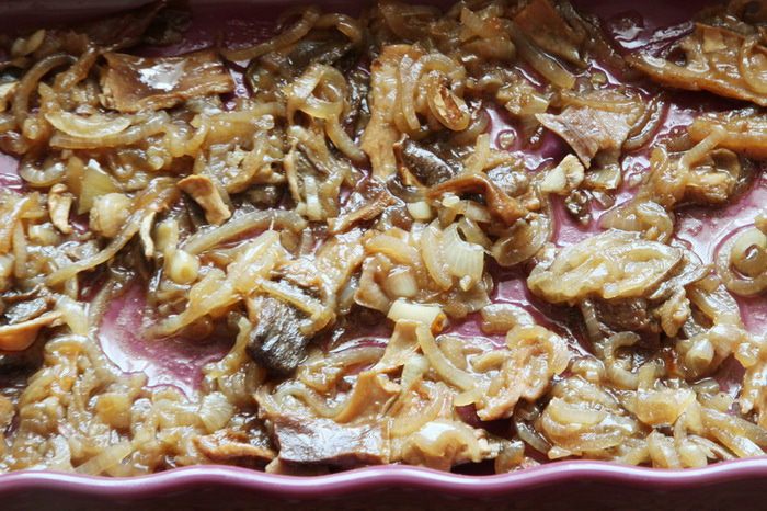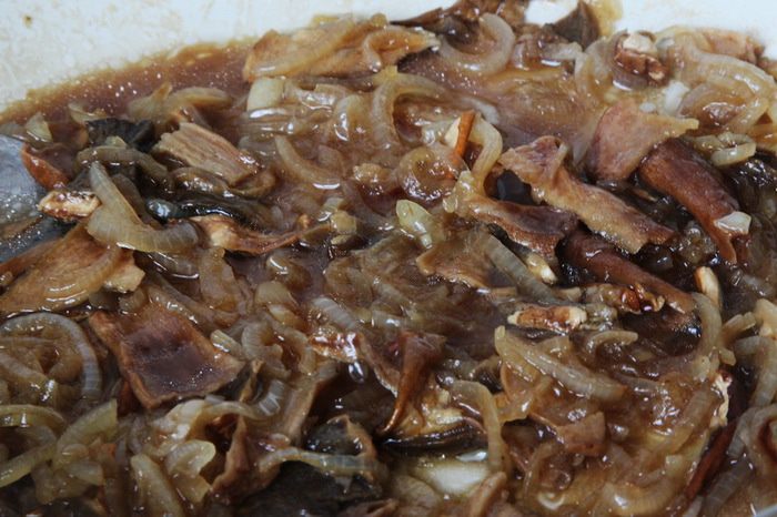 Лук режем полукольцами и на растительном масле пассеруем, затем добавляем грибы и продолжаем тушить, понемногу добавляя воду, в которой были грибы. Когда жидкость испарится, добавляем соевый соус и сахар, перец и базилик и, помешивая, готовим до выпаривания жидкости.