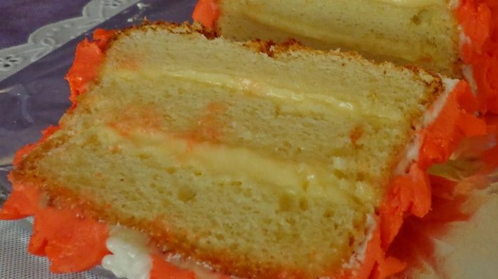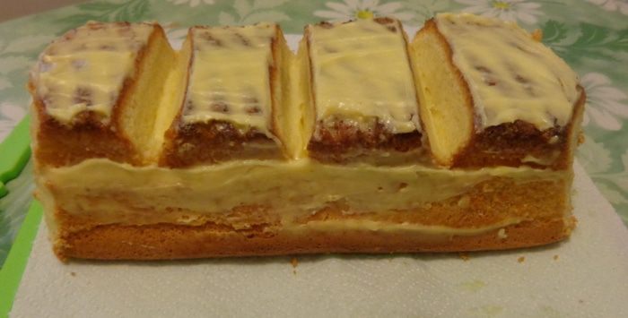 Вылить тесто в форму для хлеба. Печь до легкой золотистости и до сухой спички при 170 градусах минут 30. Готовому бисквиту дать "отдышаться" несколько часов, а лучше ночь. Потом разрезать на коржи.