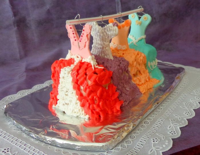 Воткнуть палочки с верхними частями платьев в торт и с помощью разноцветного крема (тот, который белковый) нарисовать низ платьев. Из подручных материалов (у меня трубочка для коктейля) сделать основу для вешалки.