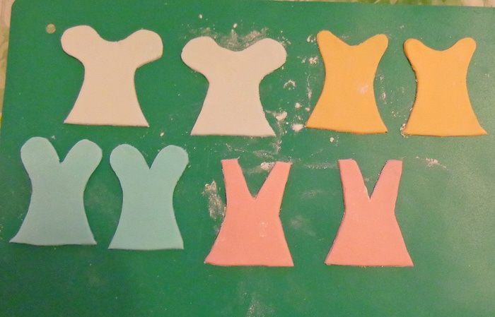 Из окрашенной в разные цвета мастики вырезать выкройки верха платьев. Подсушить их.