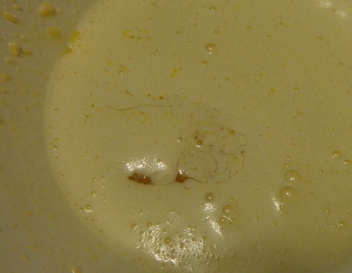 По одному по очереди добавить 3 яйца, каждый раз как следует взбивая и держа миску наклонно. Тесто увеличится в объеме в два раза.