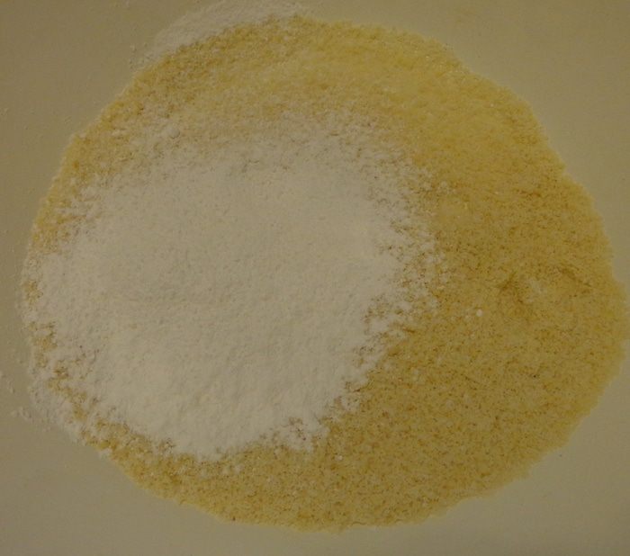 В миске для взбивания хорошенько смешать венчиком миндальную муку, сахарную пудру и одну треть сахара.