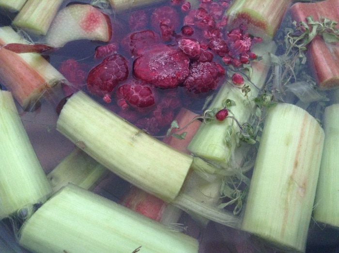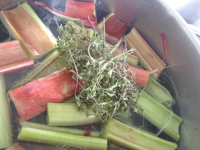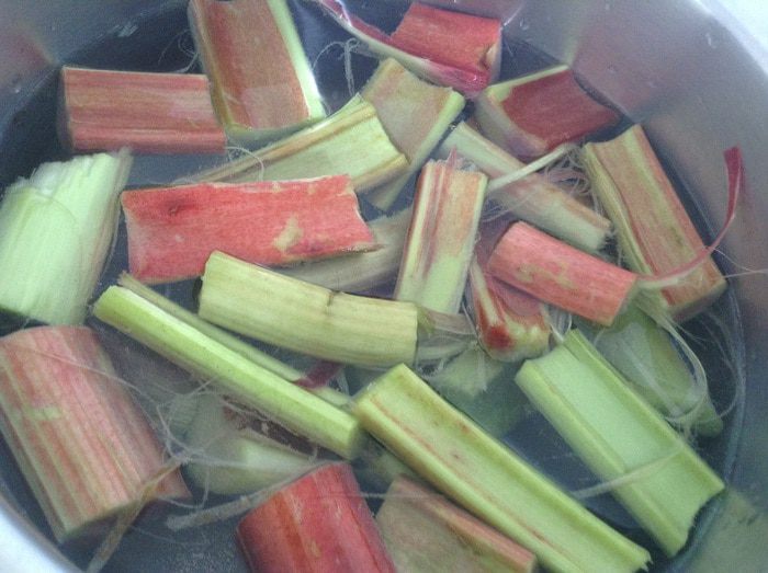 В кастрюлю налить 2,5л. воды. Добавить ревень.