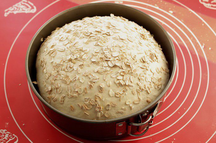 Придаем тесту круглую форму и перекладываем его в форму, смазанную растительным маслом или застеленную бумагой для выпечки. Накрываем полотенцем и оставляем на 30-50 минут в теплом месте.