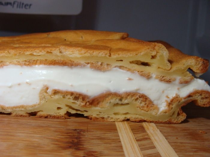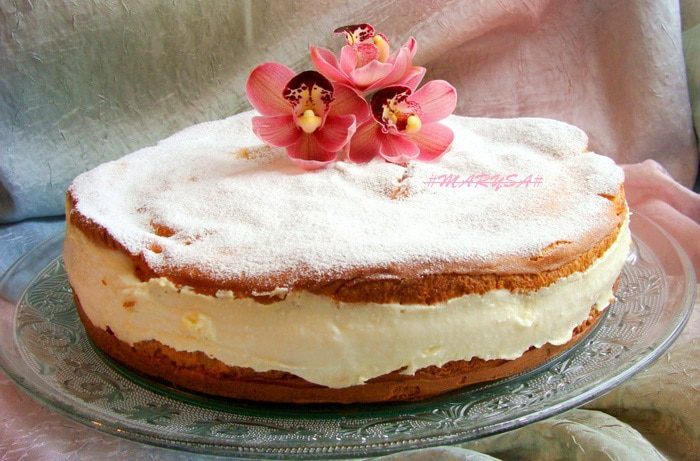 Замочить желатин в воде, настоять, потом растопить. Смешать рикотту, сливки, сахарную пудру, ванилин, потом добавить желатин, поставить в холод застывать, периодически помешивая массу. Когда масса застынет до такого состояния, что не будет растекаться, распределить ее по одному коржу и накрыть вторым, убрать в холодильник на ночь. Крем не должен быть очень плотным.