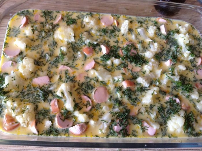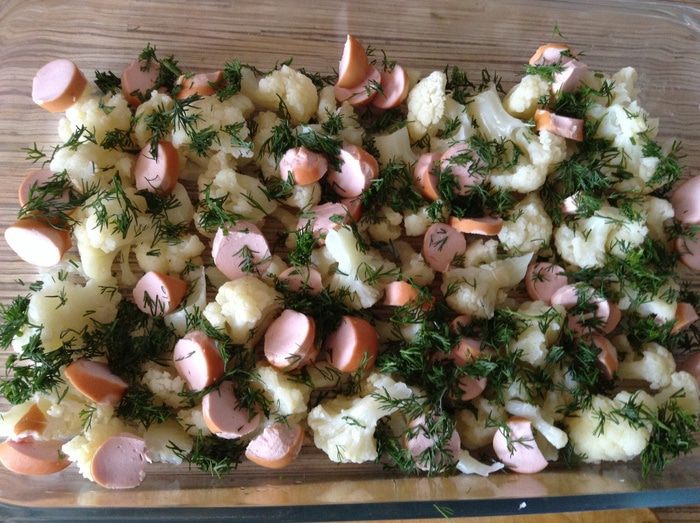 Капусту разобрать на соцветия отварить 3-4 минуты или на пару. Ветчину нарезать кубиками (у меня были сосиски), сложить все в форму. Укроп нарезать присыпать.