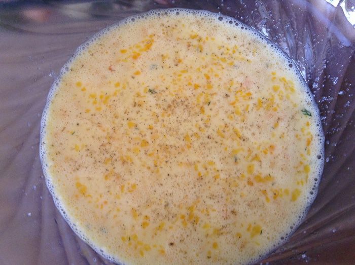Яйца взбить добавить молоко посолить по перчить.
