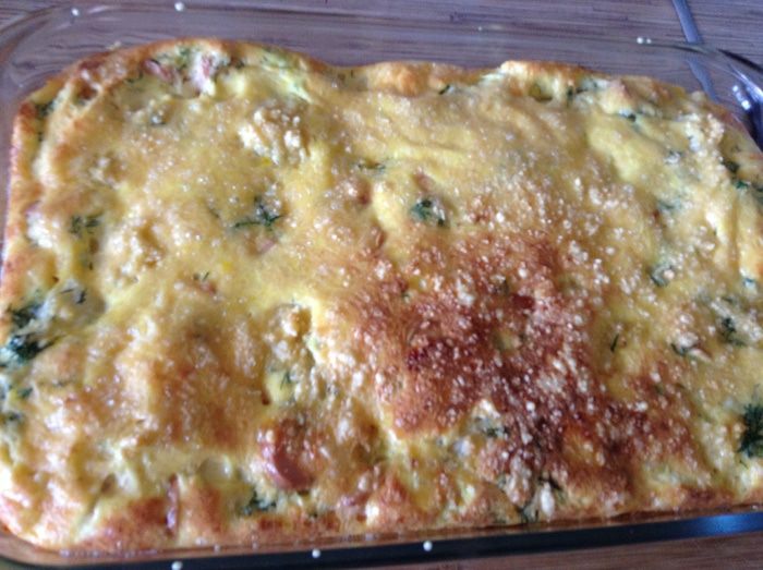 Присыпать тертым сыром, поставить в духовку при 190С на 25-30 минут. Нарезать на порционные куски. Приятного завтрака.