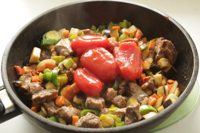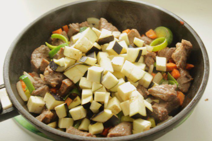 Добавить порезанный кубиками баклажан, потушить под крышкой 15-20 мин.