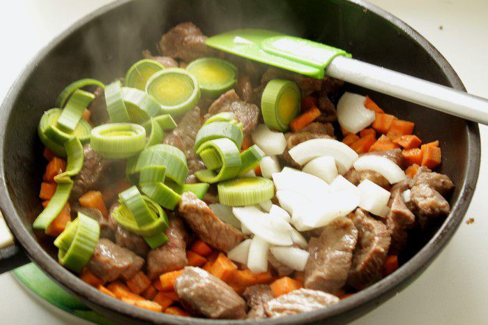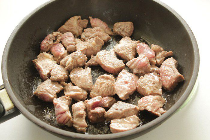 Порезать мясо на кусочки, обжарить их на растительном масле.