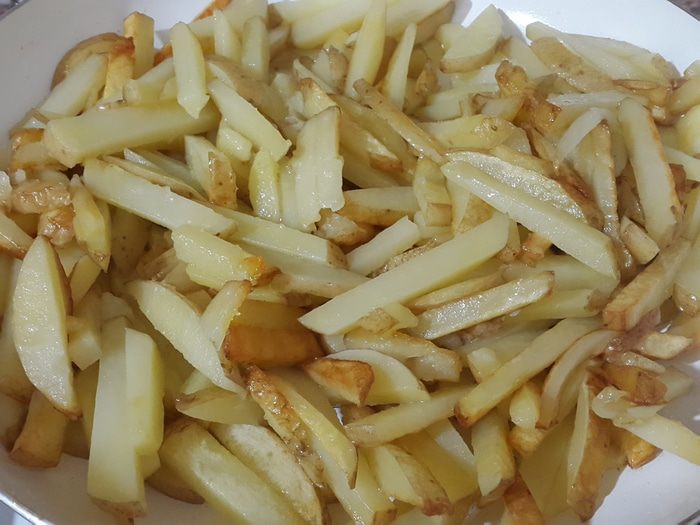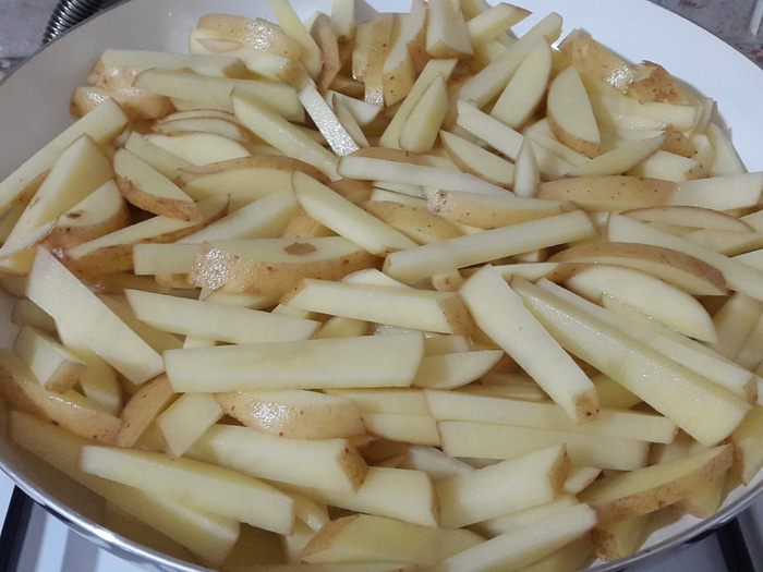 Картошку тщательно помыть (не чистить) и нарезать соломкой. В сковороде разогреть оливковое масло (немного) и выложить картошку. Жарить на большом огне, не мешая, примерно 4-5 минуты. Затем аккуратно перевернуть и жарить дальше, чтобы со всех сторон образовалась равномерная золотистая корочка.