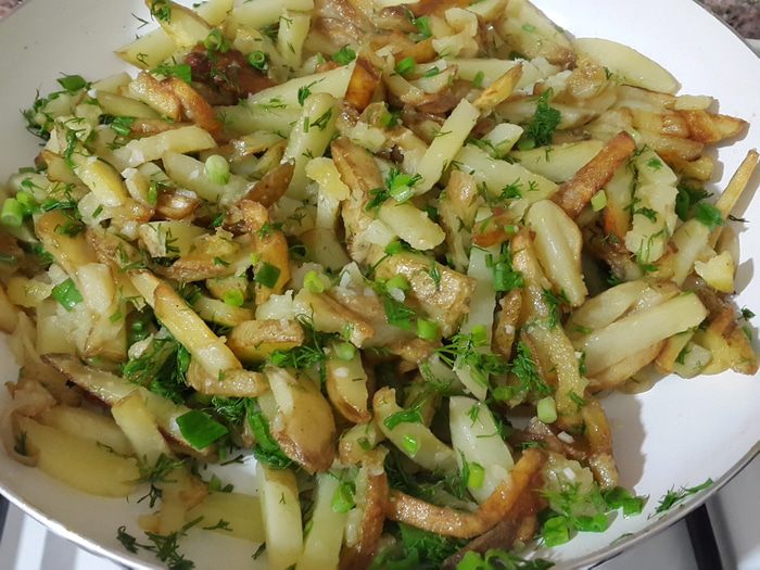 Когда картошка хорошо поджарится со всех сторон, добавить мелко нарубленный чеснок, посолить, накрыть крышкой, убавить огонь и прогреть несколько минут. Затем добавить зелень, аккуратно перемешать, прогреть ещё пару минут и сразу же подавать.