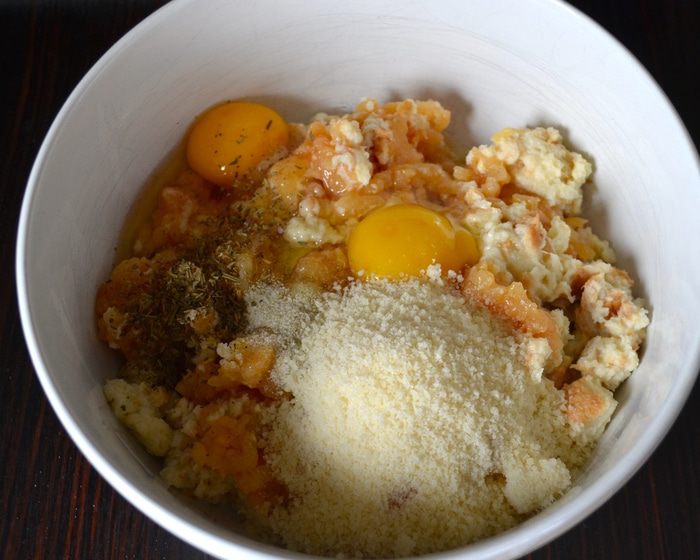 Подготовить фарш. Хлеб порезать (порвать) на кусочки и замочить молоком. как следует размять и добавить в фарш. Перемешать. Положить в миску с фаршем яйца, тертый сыр пармезан и орегано.