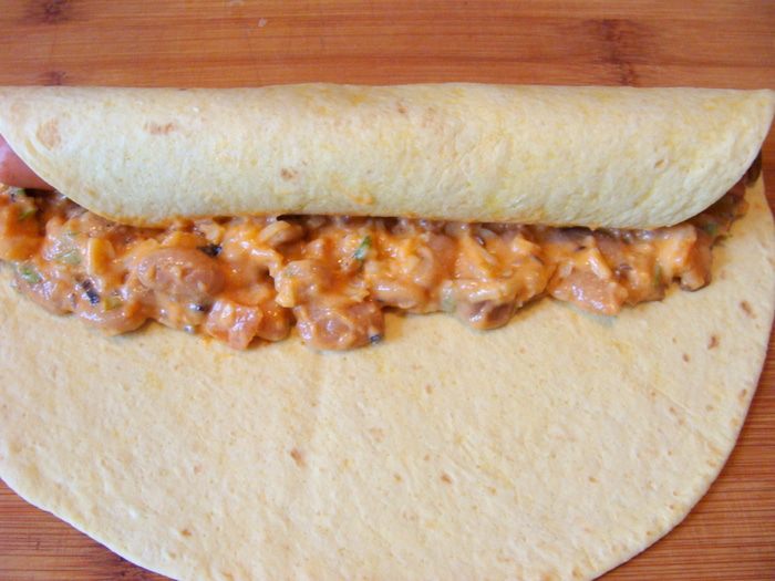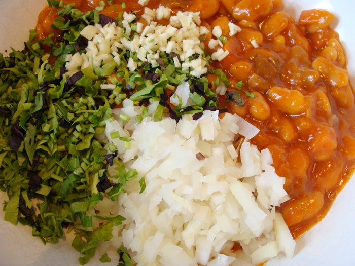 Добавить к фасоли мелко порезанный чеснок и большую часть порубленной зелени, сок из половинки лайма (можно и цедру), сметану, молотый чили. Перемешать.