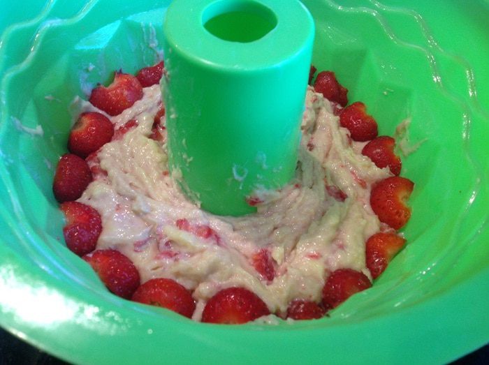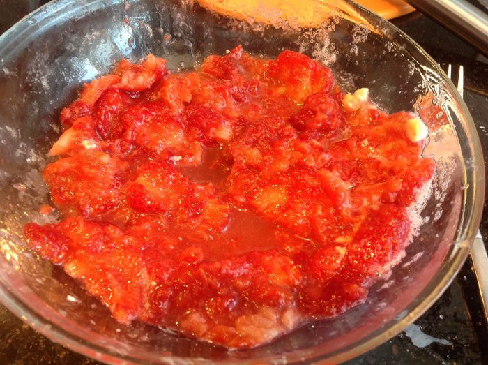 Половину клубнику разотрите в пюре, остальную нарежьте пополам. Добавьте в тесто.