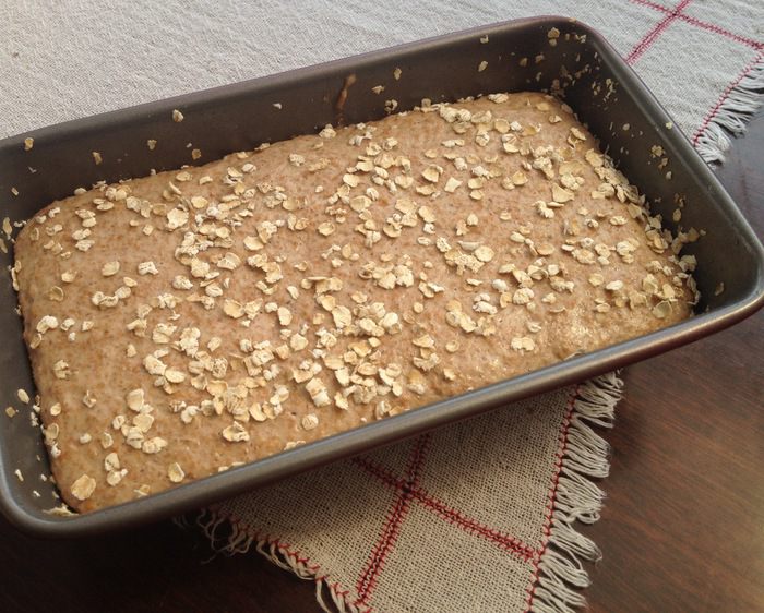 Хорошо вымесить тесто в хлебопечке или руками. Выложить в форму. Форму предварительно смазать маслом и обсыпать овсяными хлопьями или молотым льняным семенем. Влажными руками сформировать поверхность. Обмазать яичным белком и снова обсыпать овсяными хлопьями или молотым льняным семенем. Оставить для подъема.